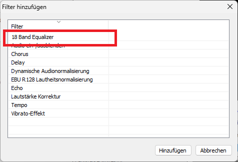 Wählen Sie aus der Audio Filterliste den "18 Band Equalizer" Filter aus und klicken Sie auf "Hinzufügen".